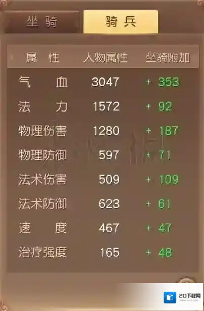 坐骑的二级属性有:气血、法力、物理伤害、物理防御、法术伤害、法术防御、治疗强度、速度8种;二级属性的成长受一级属性及坐骑的成长值共同影响;一级属性越高、成长值越高,则对应的二级属性越高。