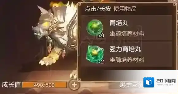 坐骑的初始成长值为100,上限为500,可以通过育培丸、强力育培丸提升,育培丸可以通过副本积分兑换,强力育培丸可以通过金币购买。