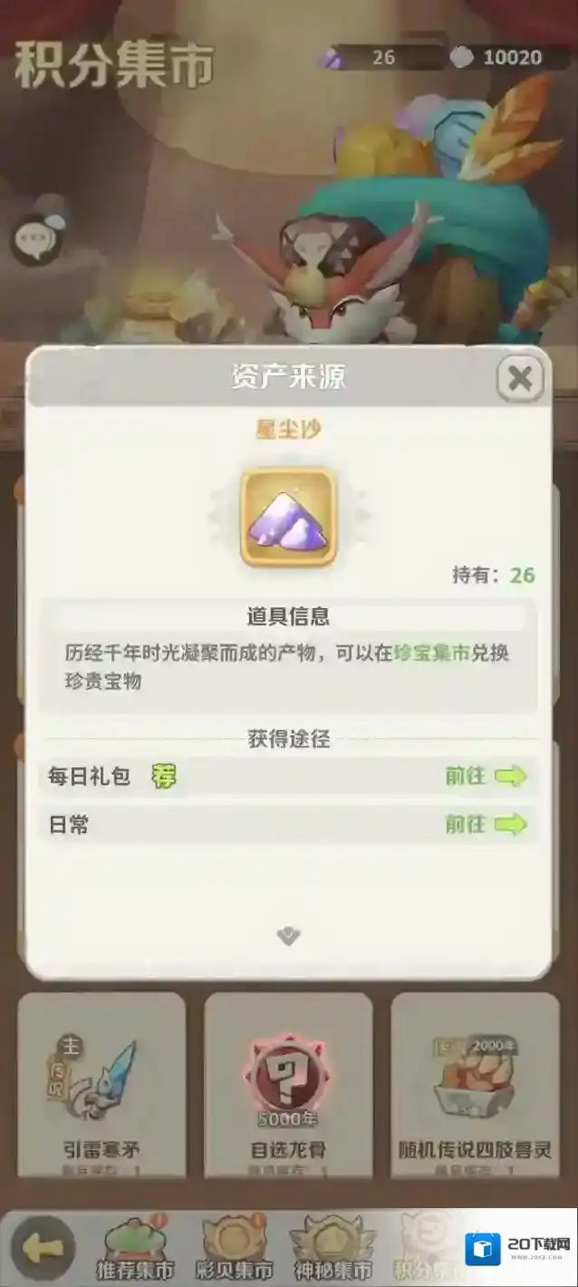 兑换推荐:珍宝集市里面的道具都很珍贵,非常建议全部兑换,但是星尘沙较难获得,所以优先建议换取自选传说宠物、传说兽灵、自选5000年龙骨等获取途径较难的内容