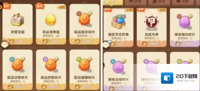 兑换推荐:优先兑换极品、稀有碎片、罕见珍果、自选千年龙骨这些库存为1的道具,宠物蛋*10也是必买的。荣誉宝箱随机性较强,可以根据剩余积分情况进行兑换