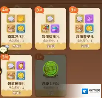 主要为付费礼包,礼包内容包括:神器锻造石(强化神器道具)、自选稀有珍果(投喂宠物提升属性)、兽灵石(用来强化龙骨)、以及大量的金币、彩贝等。