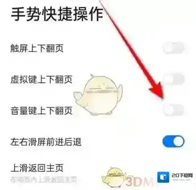 5、最后,在手势快捷操作页面里有一个“音量键上下翻页”,在它的后面点击开关按钮去设置,把按钮设置为彩色即可开启该功能。