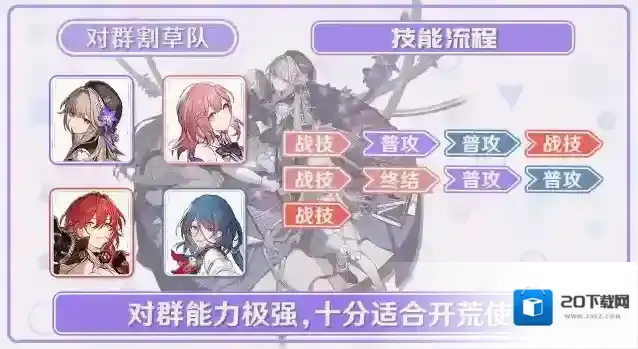 黑塔+姬子+艾丝妲+娜塔莎,这套阵容适用于对群割草的战斗环境,由艾丝妲提供攻击力增益和速度增益,姬子和黑塔双对群在处理复数敌人时战斗效率极高,可以快速结束战斗。