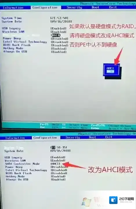 6、注意:再返回configuration这项,查看sata controller mode这项,如果默认硬盘模式为RAID,请将硬盘模式改为AHCI模式,否则进PE后不能认出硬盘,如果更改后记得按F10保存,如下图所示;