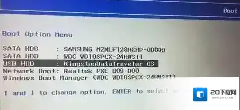7、插入制作好的U盘启动盘,重启按F12或FN+F12调出启动管理对话框,选择USB HDD识别到U盘启动进入PE,回车进入PE: