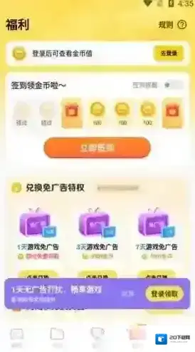 5、点开福利,玩家可以签到领金币、然后可以用金币兑换免广告的特权,让你玩游戏更加轻松。