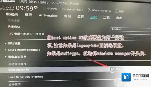 4、继续把boot option#1选项改为普通引导的,设置第一启动项为普通硬盘引导,如果采用的是uefi+gpt的就要选带Windwos Boot Manager的为UEFI引导分区,然后按F10保存设置;