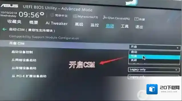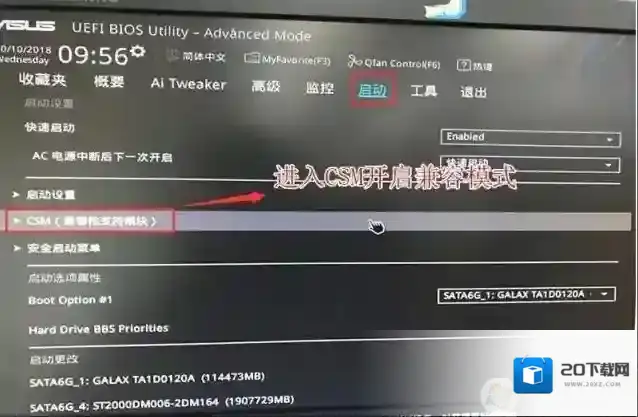 4、再返回到”启动”的选项,把CSM由disabled改成enabled,开启兼容模式,如下图所示;