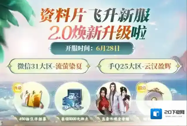 飞升服2.0携海量奖励全面迭代升级!夏季资料片主题新服微信31大区-流萤染夏、手Q25大区-云汉盈辉6月28日正式开启!人手6000元绑点,入驻即可一键飞升110级,功力直达15万、战力超越22万,更多玄河焕生礼盒、风水许愿树、天涯令·五、天涯令·四、神侠招募令、万象神兵质料、5套时装等万元道具奖励海量送,回归少侠更专享最高百万的天赏积分返利及外观自选继承至新服!