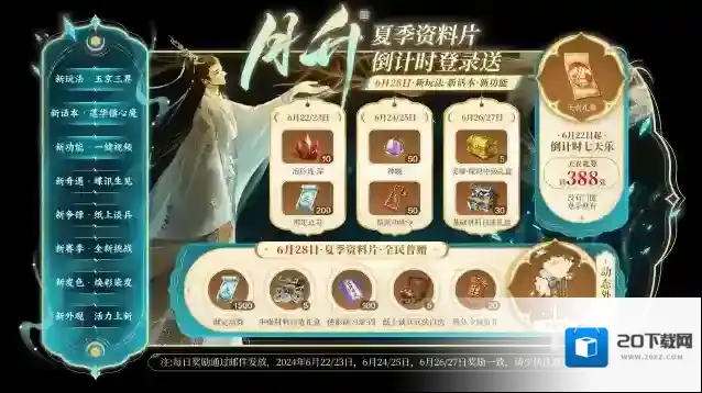 6月22日至6月28日全民普赠388张天衣礼券,还有绑定点券、兵法自选、动态外观芙蓉缀等多重好礼,登录游戏即可领取,奖励通过邮件发放。