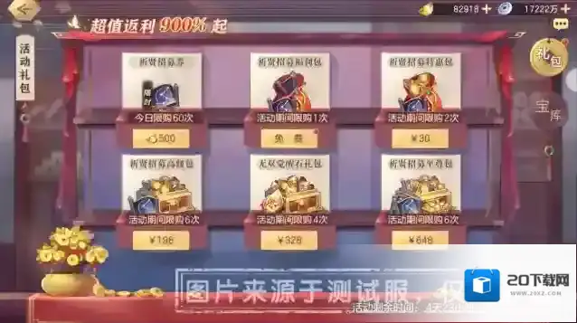 4、祈贤招募高级包:内含祈贤招募券*20、元宝*1980,售价198元,活动期间限购6次。
