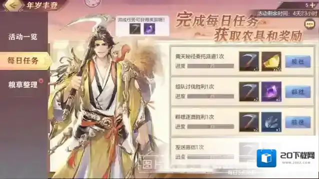 活动期间,完成指定的每日任务可获取「丰登农具、无华命魂石、百炼石」等奖励,每日任务将于每日5点刷新,不会累计至次日,还请小将军注意参与哦