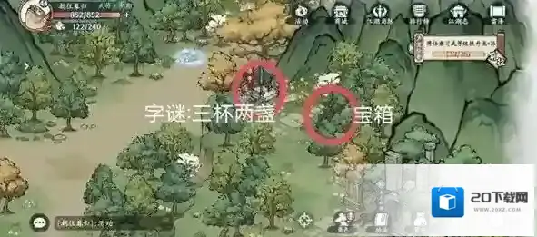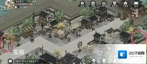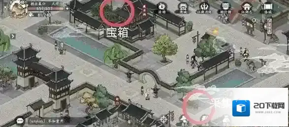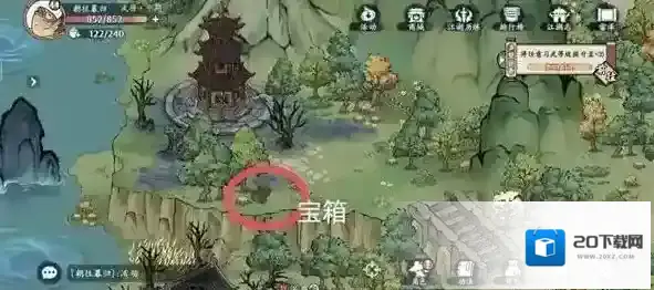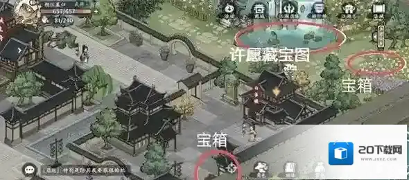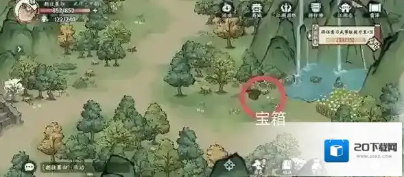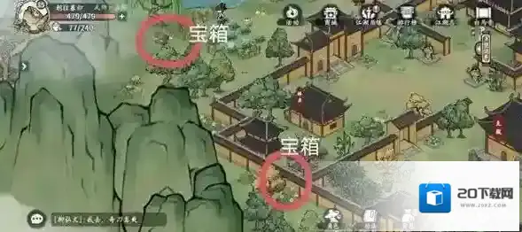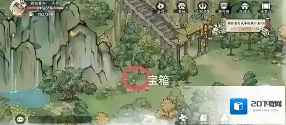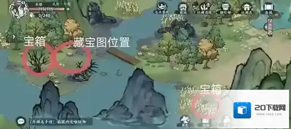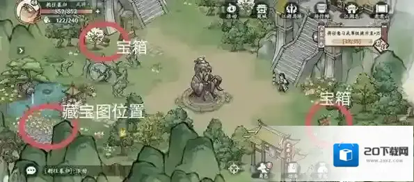 4、宝箱分别在左上中间和右下,藏宝图在左上,江湖事件在右边。
