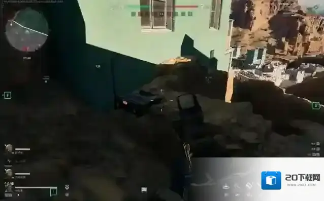 来到图中的位置后,攀爬上弹药箱,随后向右边的棚子上跳,然后攀爬上墙的裂缝,然后爬梯子到最高点即可看到