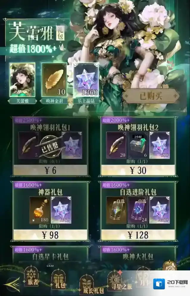 启程礼包:应该是过了新手期会上的一次性礼包,在商店就能看到,有30元20个的抽卡羽毛、芙蕾雅礼包等,性价比全都非常高;还有328自选的星卡礼包,除了一张星卡外还有6000多钻和好几个8小时资源箱子,3测时真的让我战力起飞了~不过还是有点贵的,大家可以酌情购买~