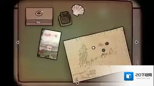 23、潜水艇—操作台视角:点击小桌板上的瓶中船,拔掉软木塞后用(鱼钩)勾住小船的桅杆,多次拉动鱼线后桅杆被拽断掉到了小桌板上,从桅杆的根部取出一张卡片,根据卡片上的提示在地图上找出对应的点,整合信息后获得坐标:“X:3、Y:4、D:50”;点击操作台,将获得的坐标输入。