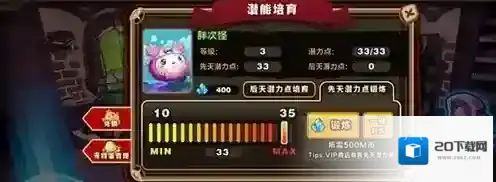 6、玩家还可以对宠物进行潜能培养,分为先天潜能和后天潜能培养,后天主要通过喂食不同品质的宠物蛋和金币获取不同的潜力经验条(c、d级普遍为20,部分c级为100),在喂养过程存在有折扣,满足一级增加一潜力点。而先天主要通过商店购买先天潜力果和钻石进行培养(成本较高)。
