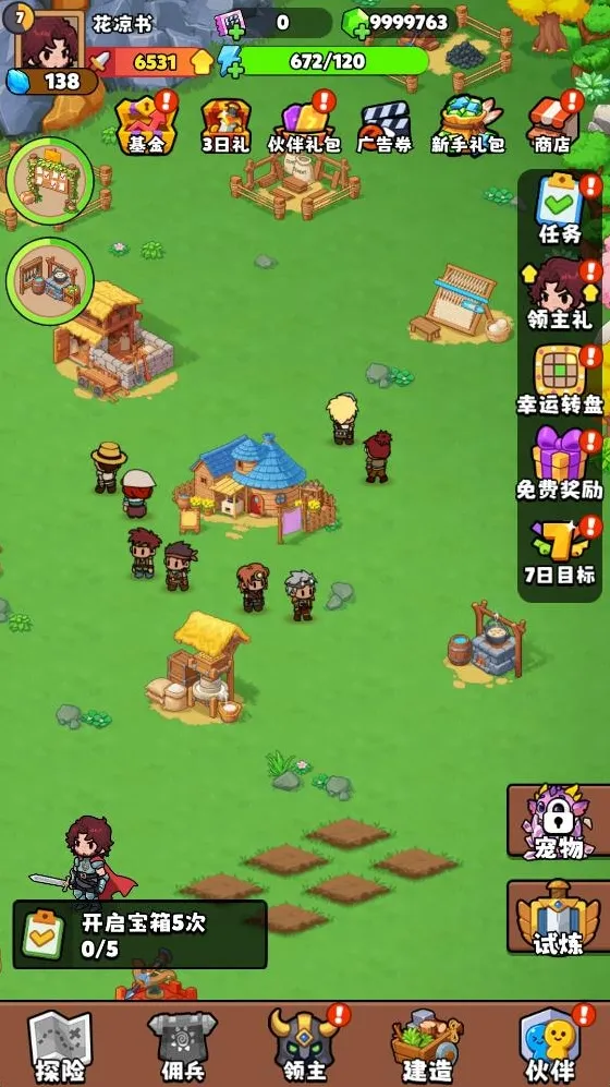 游戏中你需要修建不同的设施来建设自己的家园,通过点击地图里的树木石头杂草来获得不同的资源,利用这些资源升级或者修复建筑,派遣不同的伙伴来完成各种工作,招募不同的英雄击退各种各样的怪物,不断升级你的家园等级来打造最棒的小镇。