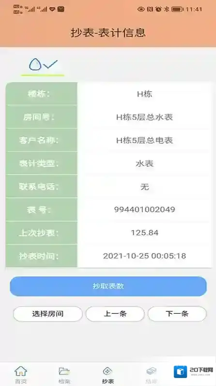 3、拥有详细的抄表信息,包括地址、楼栋、房间号、表编号、上次度数、抄表时间等。