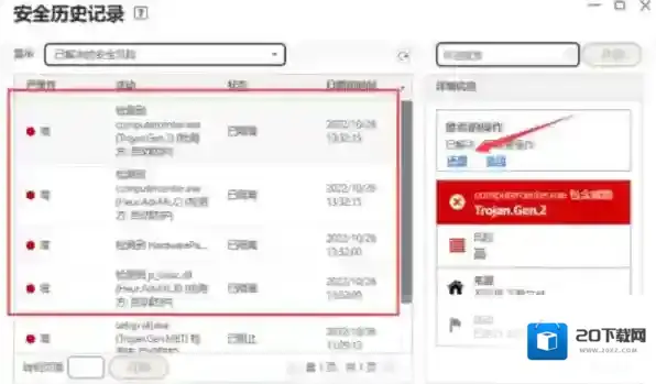 4、还有一种情况,是鲁大师的部分文件被隔离,我们打开杀毒软件,在安全历史记录中查看隔离记录,将其还原即可。