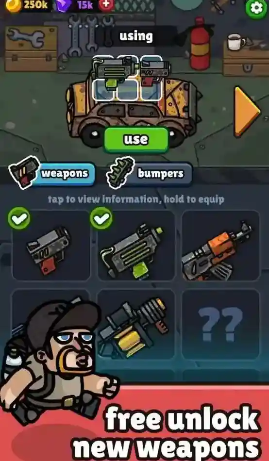 3、消耗金币可以升级你的车辆,可以提升武器威力或者增加血量。
