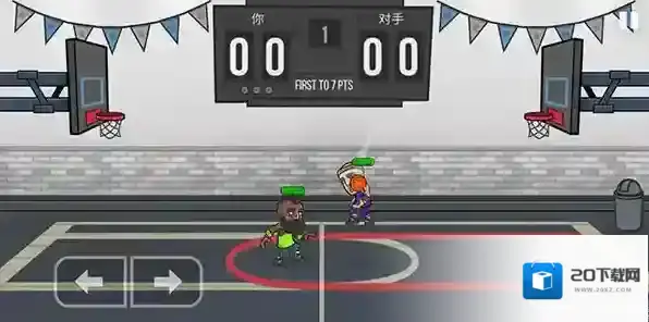 2、我们按住屏幕左下角的两个箭头可以控制角色移动,用手指按住屏幕右侧空白区域可以控制角色跳投,不过跳投的时候的注意一点,在主角跳到空中的时候就得放开手指,否者我们的角色是不会将篮球投出去的。